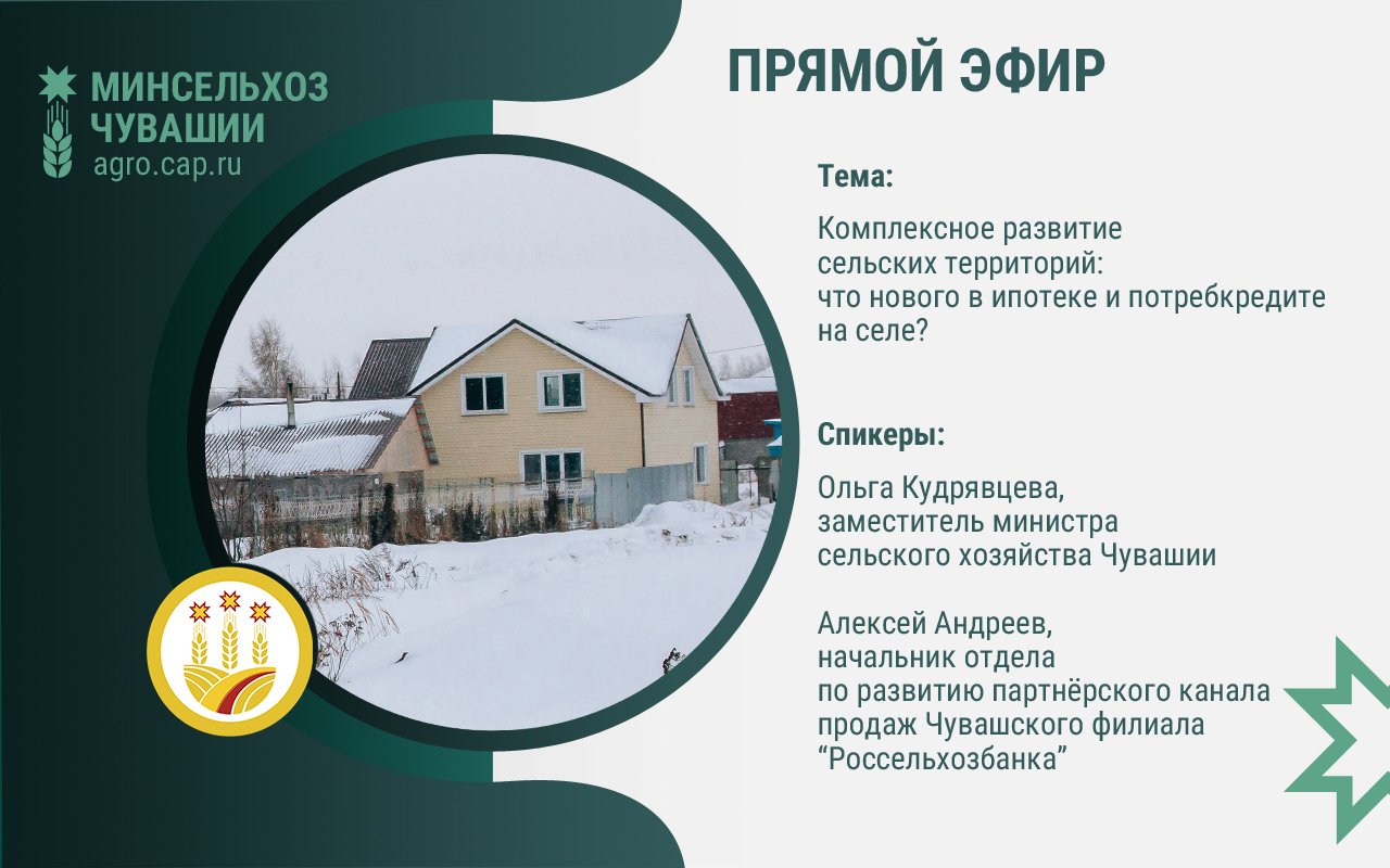 О нововведениях программы льготной сельской ипотеки и потребкредита для жителей села рассказали заместитель министра сельского хозяйства Чувашии Ольга Кудрявцева и начальник отдела начальник отдела по развитию партнёрского канала продаж Чувашского филиала «Россельхозбанка» Алексей Андреев во время прямого эфира в сообществе «Чувашская Республика» в соцсети «ВКонтакте».