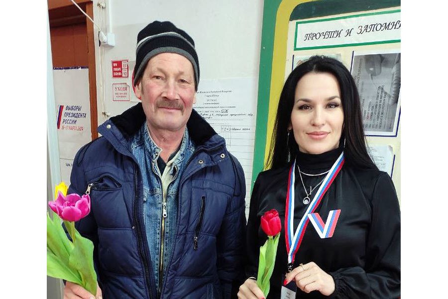 Он пришел на свой Большетокшикский избирательный участок с весенними цветами.