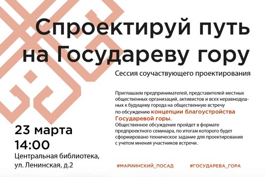 Приглашаем вас на сессию соучаствующего реагирования, которое состоится 23 марта в 14:00 в здании библиотеки по адресу: г. Мариинский Посад, ул. Ленинская, д. 2. Встреча пройдёт в формате предпроектного семинара с участием команды проектно-консалтингового агентства «Sheredega Consulting» и архитектурного бюро dot.bureau. По итогам встречи будет сформирована концепция благоустройства Государевой горы — участницы Всероссийского конкурса малых городов и исторических поселений.