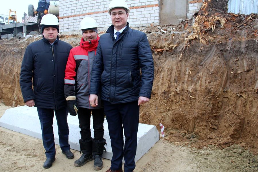 На объекте работа просто «кипела». Алексей Николаевич и Александр Валерьевич пообщались с руководством и рабочими строительной организации. Затем они вместе со строителями положили первую плиту фундамента детского сада.