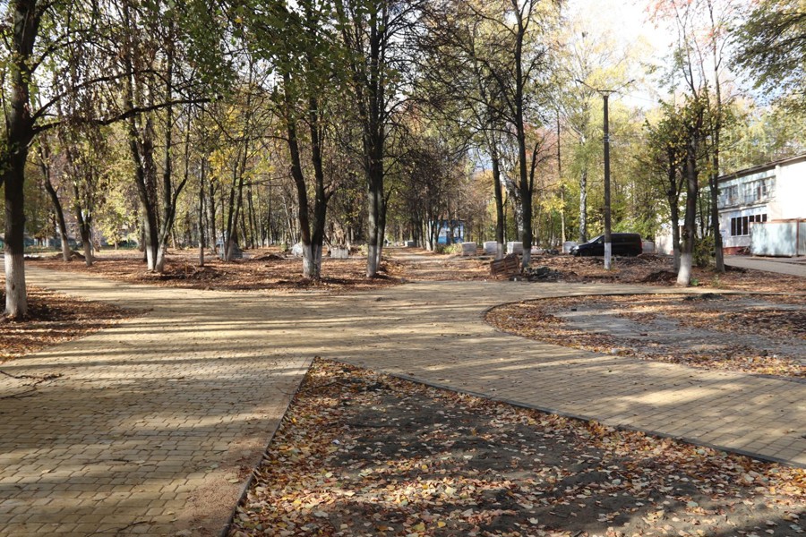 На данный момент завершено асфальтирование велодорожек, уложили кабеля освещения, провели монтаж оснований столбов освещения, уложено уже 70% брусчатки, также проводятся работы по подготовке основания для будущего памп-трека, установке малых архитектурных форм и закладных для освещения.