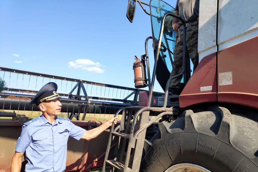 При осмотре зерноуборочных комбайнов начальник инспекции уделил особое внимание вопросам пожарной безопасности. Стоит отметить, что в АО «Куснар» в комплексе уборочного звена имеется автомобиль-цистерна, который оборудован для пожаротушения.