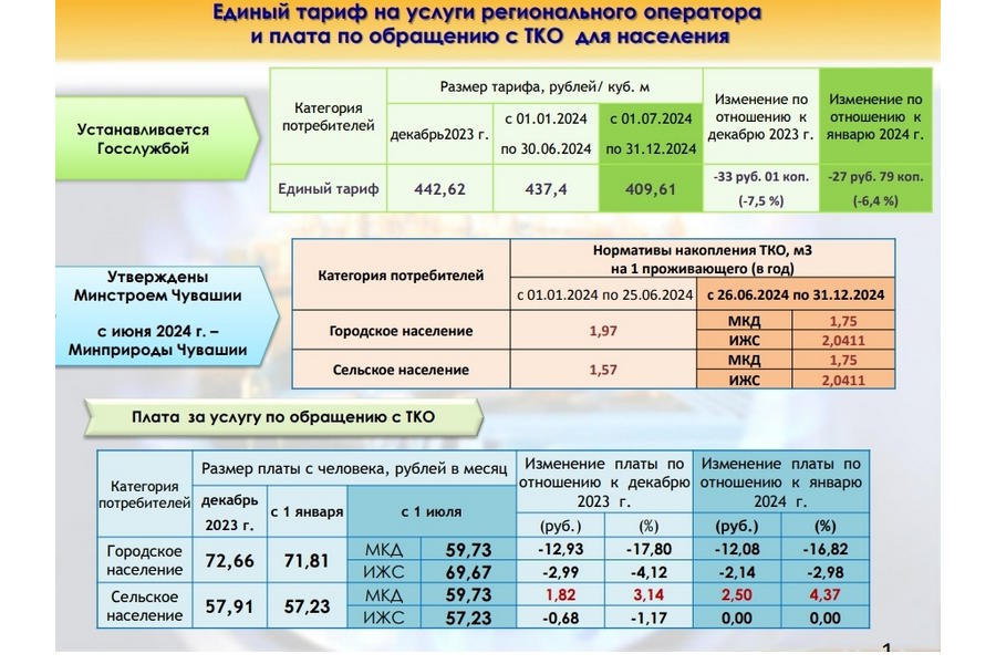 Плата за услугу по обращению с твердыми коммунальными отходами будет рассчитываться для населения, проживающего в многоквартирных домах, и населения, проживающего в индивидуальных жилых домах. В целом по республике ожидается снижение платы за услугу регионального оператора. При этом для сельских жителей, проживающих в индивидуальных жилых домах, платеж должен был вырасти на 12,44 руб./чел. в месяц. В связи с этим 14 июня 2024 г. принят Закон Чувашской Республики № 38 «О льготных тарифах в области обращения с твердыми коммунальными отходами на территории Чувашской Республики». Также постановлением Госслужбы от 21 июня 2024 г. № 20-8/в «Об установлении льготных единых тарифов на услугу регионального оператора по обращению с твердыми коммунальными отходами в Чувашской Республике, оказываемую Обществом с ограниченной ответственностью «Ситиматик Чувашия», на 2024 год» установлен льготный тариф на услугу по обращению с ТКО для населения, проживающего в индивидуальных жилых домах на территории сельских населенных пунктов, в связи с чем размер платы для указанной категории потребителей не изменится и останется на уровне 57 рублей 23 копейки.