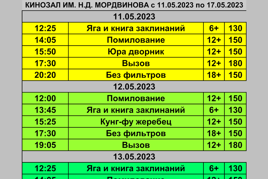 Расписание кинозала им. Мордвинова с 11 по 17 мая
