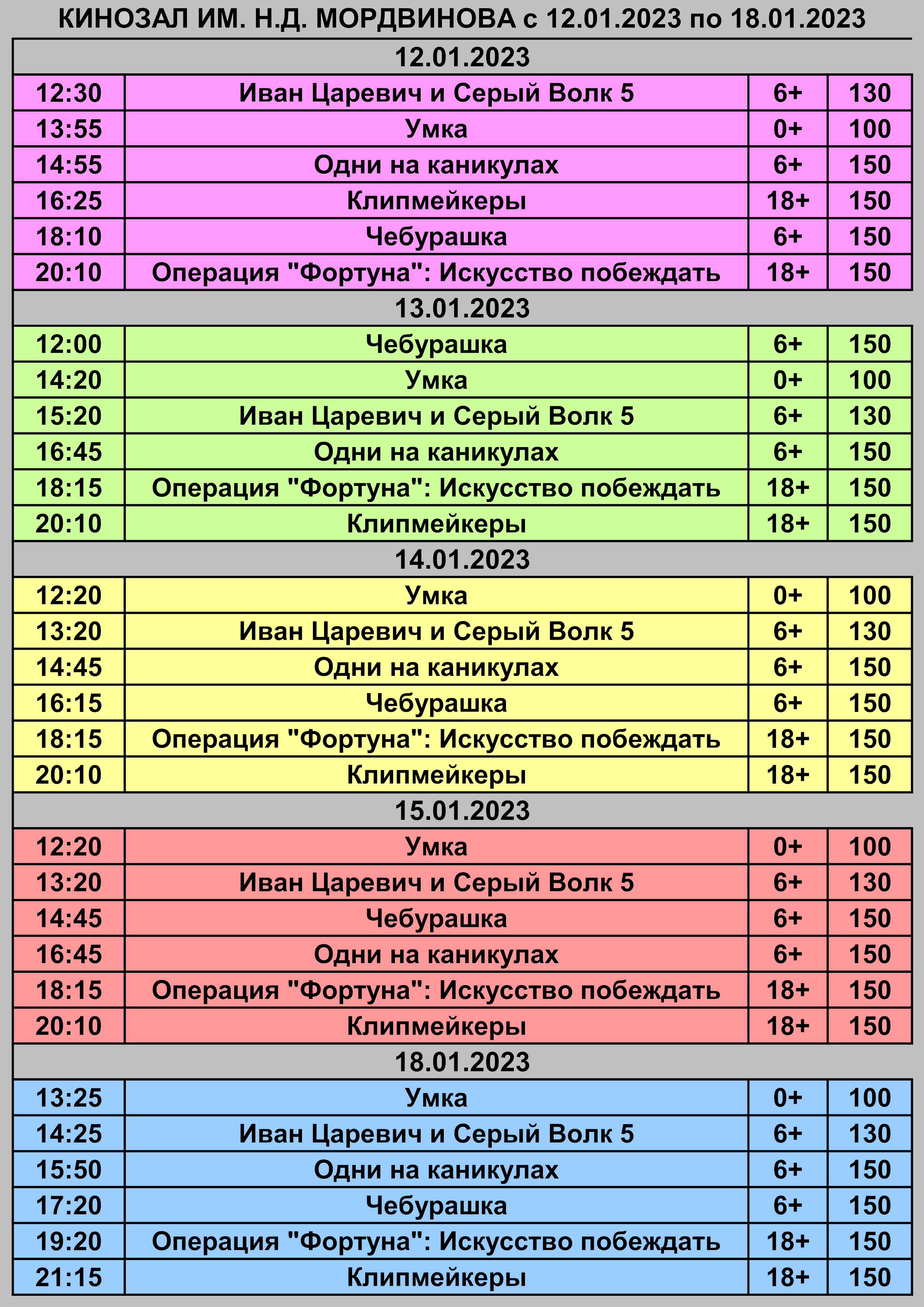 Расписание Кинозала им. Н. Д. Мордвинова с 12 по 18 января