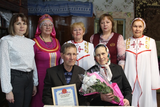 От имени главы Ядринского муниципального округа С.Трофимова начальник отдела ЗАГС Н.Леонтьева вручила Благодарственное письмо за крепость семейных устоев, основанных на взаимной любви и верности, и достойное воспитание детей, цветы и памятный подарок. К поздравлению присоединились и.о.начальника Большечурашевского территориального отдела В.Тимофеева, приглашенные гости.