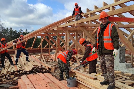 В настоящее время на объекте работают 40 человек. Выполняются работы: устройство стропильной системы кровли, утепление фасада здания, выравнивание внутренних стен, устройство полов, электромонтажные работы, работы по прокладке внутренней системы водопровода и канализации.