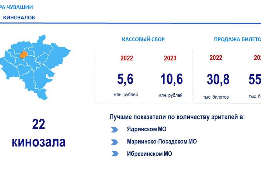 В Чувашской Республике работают 22 кинозала, открытых при поддержке Фонда кино. Все кинозалы подключены к программе «Пушкинская карта». В 2023 году в кинозалах Чувашии демонстрировались главные премьеры популярных российских фильмов, а также фильмы, направленные на нравственное, духовное и патриотическое воспитание молодого поколения: «Где проходит граница?», «Нюрнберг», «Святой архипелаг», «Сокровища партизанского леса», «Форсаж. Возвращение».