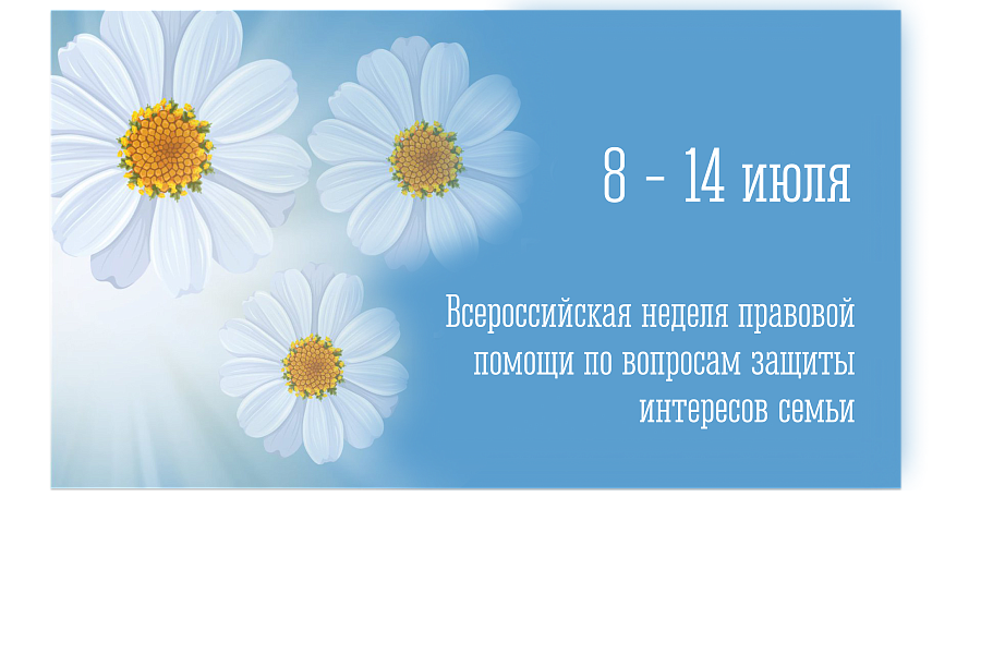 В июле 2024 года в России впервые пройдет Всероссийская неделя правовой помощи по вопросам защиты интересов семьи, приуроченное к проведению Года семьи и Дня семьи, любви и верности. Мероприятие пройдет с 08.07.2024 по 14.07.2024 года.