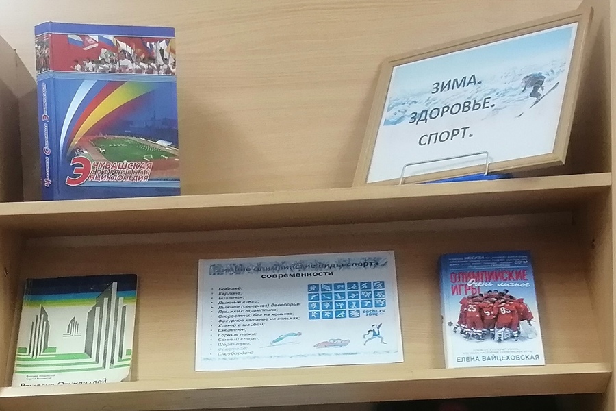 На абонементе Ядринской центральной библиотеки оформлена выставка-рекомендация «Зима. Здоровье. Спорт», на которой представлена литература, посвященная разным видам спорта, популярным в зимний период. Есть на выставке и краеведческие издания — книги, посвященные развитию спорта, а также «Чувашская спортивная энциклопедия», рассказывающая о сильных, смелых и мужественных спортсменах Чувашии, добившихся значительных успехов в лыжном спорте, о чемпионах и призерах Олимпийских Игр, прославивших свою малую Родину.