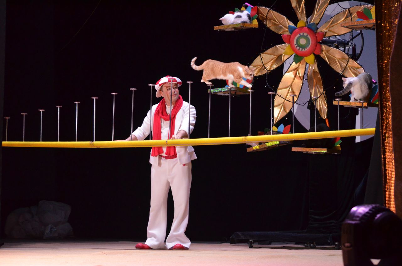 Они летают на воздушном шаре, катаются на велосипеде, прыгают через препятствия и лазают по канату вверх ногами (то есть лапами). Среди них есть ленивцы, весельчаки, проказники и трусы. И к каждой кошке Дмитрий Куклачев находит индивидуальный подход. Как мы заметили, “пряником” может быть не только лакомство, но и ласка, скандирование имени, внимание зрителей.