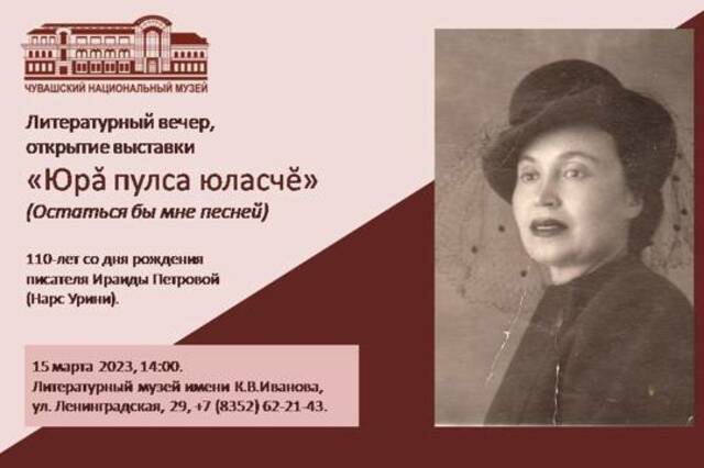 15 марта, в 14 часов, в честь 110-летия со дня рождения писателя Ираиды Петровой (Нарс) в Литературном музее имени К.В. Иванова в Чебоксарах пройдет литературный вечер «Остаться бы мне песней», также откроется выставка.