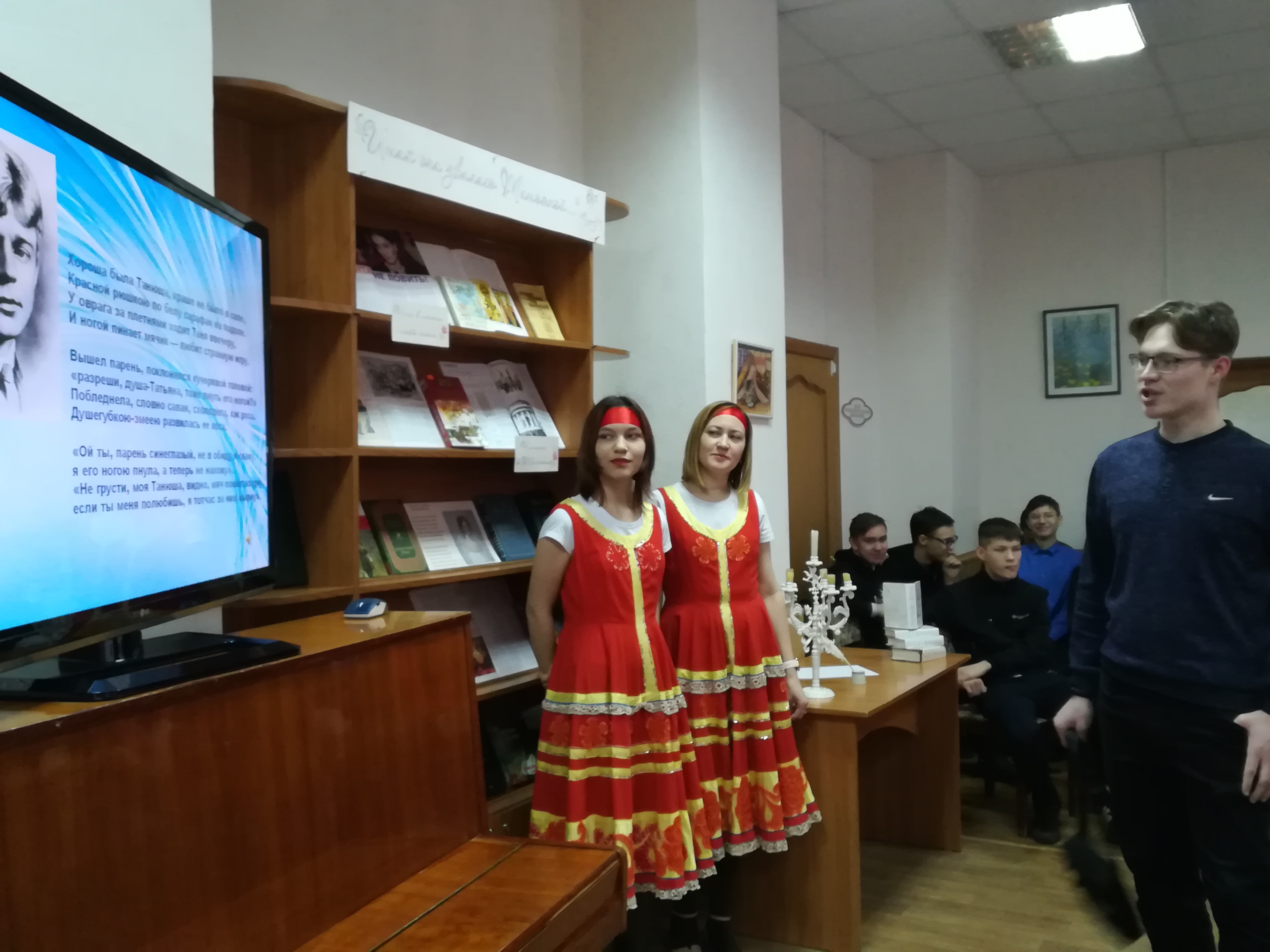 Под русскую народную музыку, в ярких народных костюмах к ребятам вышли библиотекари Манастырная О., Николаева О., которые рассказали о добрых традициях и обычаях празднования Татьяниного дня и Дня российского студента, угостили зрителей караваем и познакомили с книгами писателей - классиков, представленными на выставке «Итак, она звалась Татьяной…», главными героинями которых являются прекрасные и величайшие Татьяны. Также студенты совершили исторический экскурс, посвященной покровительнице Татьян – святой мученице Татиане, вспомнили образ Татьяны из поэмы Пушкина «Евгений Онегин», узнали о значении этого имени. По душе молодежи пришлись и литературное караоке – ремейк по стихотворению Агнии Барто «Наша Таня громко плачет», музыкальное караоке, конкурсы и игры.
