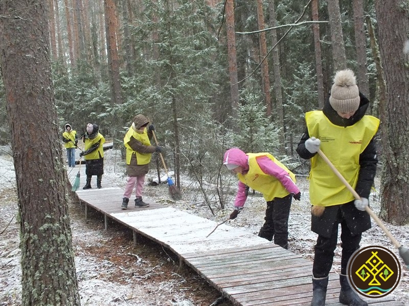 Очищая стенды, объекты и настилы от опавшей листвы, заледеневшей хвои ребята не просто работали, но и познавали природу охраняемой территории. Не снимая перчаток, не откладывая мётлы в сторону, они любовались лесными пейзажами, знакомились с древесной растительностью национального парка и информацией о животном мире родного края.