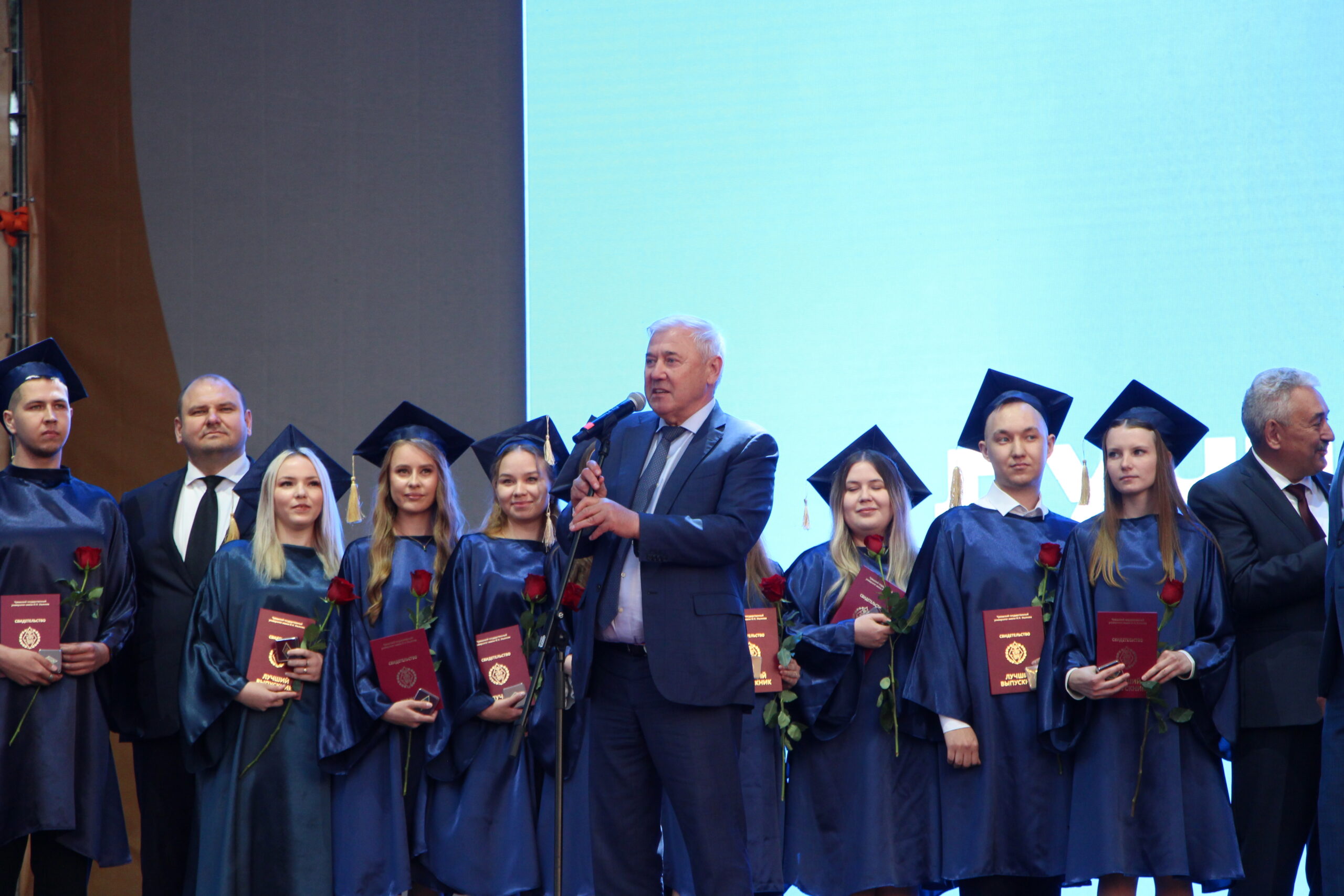 «Вы много делали не только на студенческой скамье – учились, грызли гранит науки, – но и в самых разных сферах университетской жизни. Наши студенты стали чемпионами и призерами различных олимпиад и конкурсов. У нас учатся участники Олимпийских игр и мастера спорта международного класса. Студенты ЧувГУ покорили Эльбрус и водрузили флаги университета и республики на эту вершину. Сегодня для вас открыты все двери: кто-то пойдет работать по профессии, кто-то продолжит обучение в университете – в магистратуре, аспирантуре, и мы будем рады видеть вас в стенах родного вуза. Уверен в одном – вы принесете большую пользу своей стране, республике и еще не раз дадите повод гордиться вами» , – отметил ректор Чувашского госуниверситета А.Ю. Александров , выступая перед выпускниками и их родными.