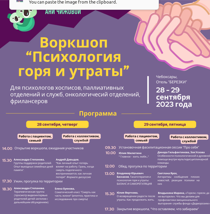 Две основные темы воркшопа - работа с пациентом и его семьей, а также работа с сотрудниками хосписов и паллиативных служб. Ведущими станут опытные эксперты: Андрей Давыдов, психолог фонда "Дом с маяком", Александра Степанова, психолог фонда им. Ани Чижовой, Елена Буянова, психолог, ведущая холистических танцев, Юлия Верткова, психолог, акушерка и многие другие.