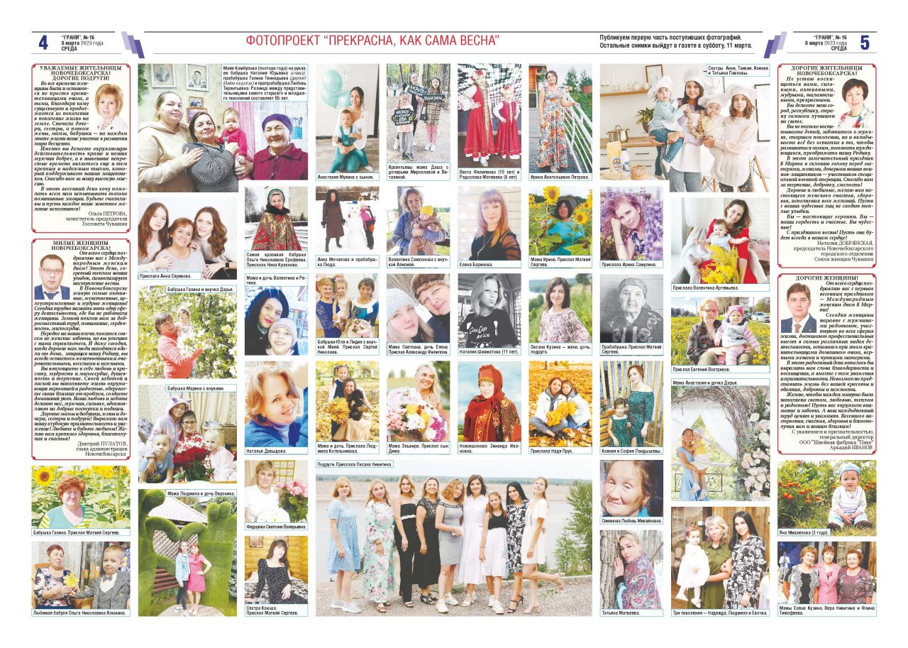 В Новочебоксарске живут самые активные, женственные, целеустремленные и мудрые женщины! Сегодня трудно назвать хоть одну сферу деятельности, где бы не работали женщины. Земной поклон вам за добросовестный труд, понимание, сердечность, милосердие.