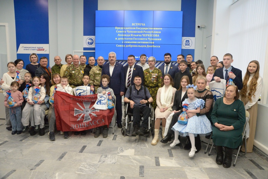Спикер Парламента Леонид Черкесов и заместиль Председателя Госсовета Чувашии Виктор Горбунов, депутаты Олег Дельман, Юрий Зорин, Александр Титов и Роман Алексеев вручили детям участников специальной военной операции новогодние подарки.