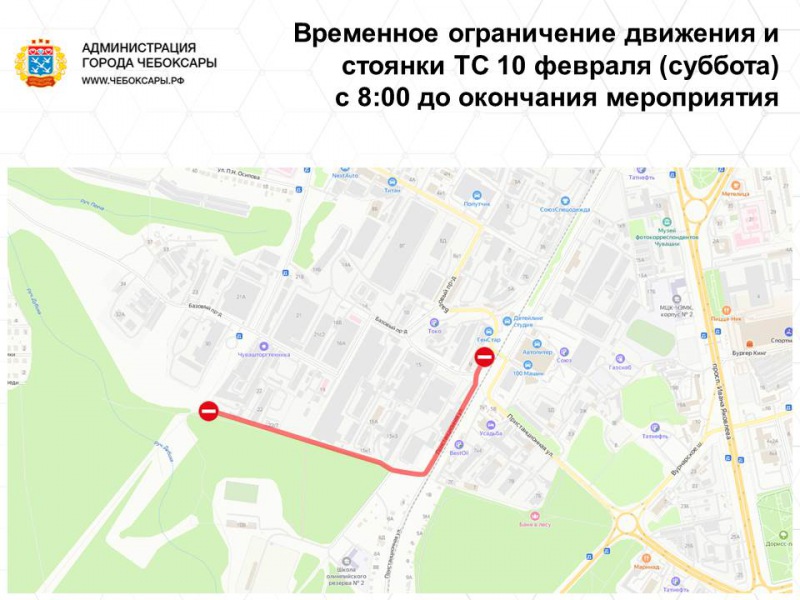 В субботу же, 10 февраля, с 08:00 и до окончания мероприятий вводится ограничение движения и стоянки транспортных средств на участке ул. Пристанционная от пересечения с железнодорожным переездом до спортшколы им. А.Тихонова.