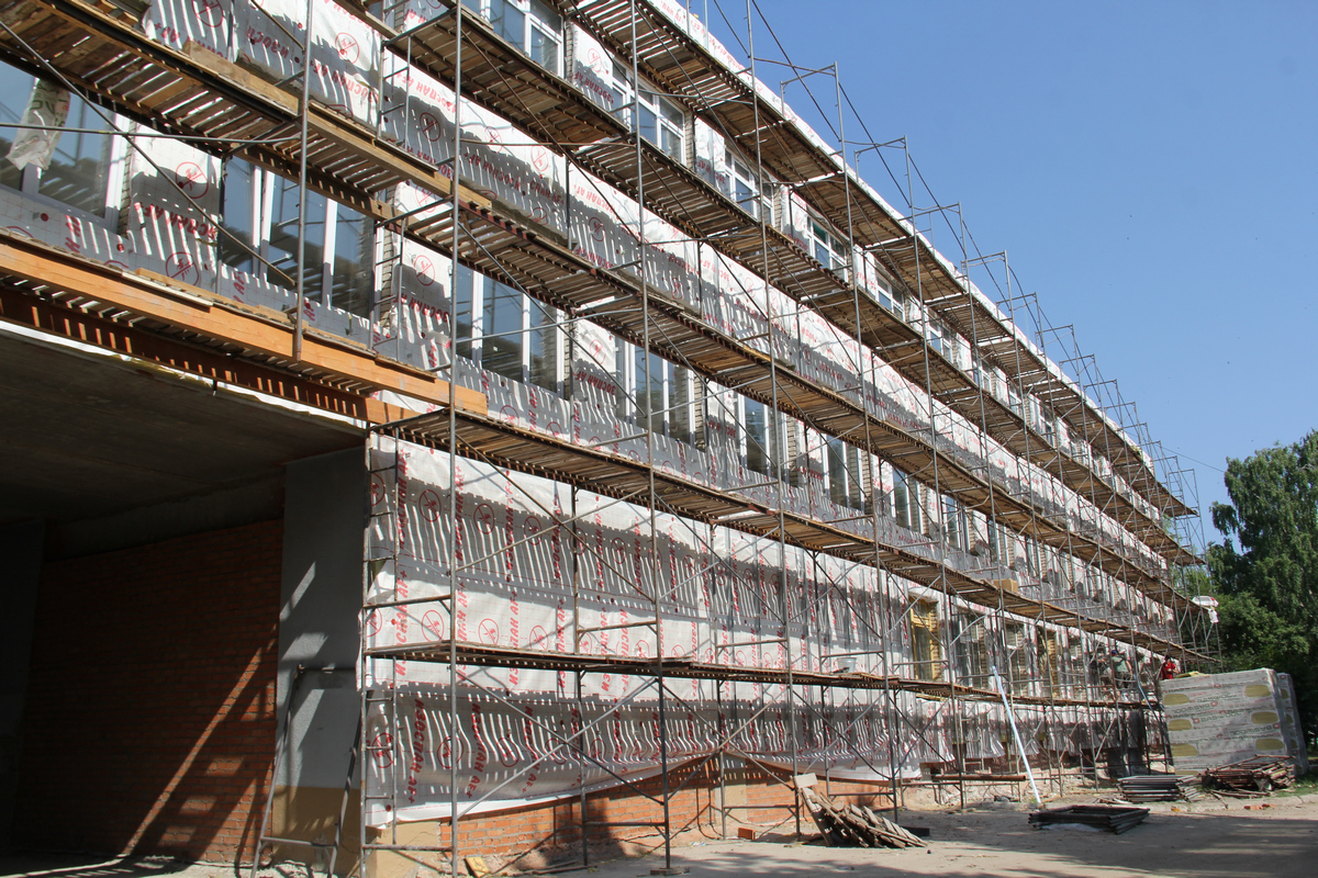 Начать следует с того, что изменения с нашего прошлого визита видны невооруженным глазом. Так, фасад обзавелся лесами. Рабочие приступили к его утеплению и облицовке. Одновременно работы ведутся сразу на нескольких участках: где-то монтируют сантехнику в туалетах, где-то идет финишная отделка стен коридоров. Завершаются кровельные работы.