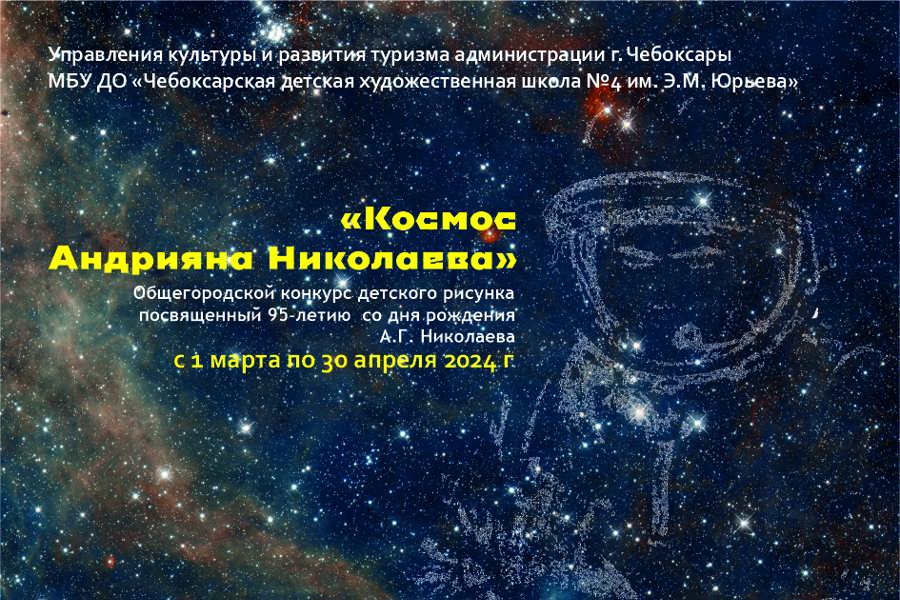 Празднование 95-летия со дня рождения легендарного летчика-космонавта СССР, Андрияна Григорьевича Николаева, стало поводом для проведения общегородского конкурса детского рисунка в Чебоксарах. Организаторами мероприятия выступают Управление культуры и развития туризма администрации города и МБУ ДО «Чебоксарская детская художественная школа 4 им. Э.М. Юрьева».