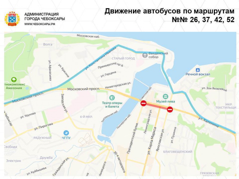 С 8 час. 00 мин. до 14 час. 00 мин. 9 мая ограничивается движение транспортных средств по проспекту Ленина (от пересечения с улицей Ю. Гагарина до улицы Карла Маркса), улицам Карла Маркса, Композиторов Воробьевых (от пересечения с Президентским бульваром до пересечения с улицей Ярославская), Ленинградская (от пересечения с улицей Композиторов Воробьевых до пересечения с площадью Красной), Президентскому бульвару (от пересечения с улицей Композиторов Воробьевых до пересечения с площадью Красной) города Чебоксары.