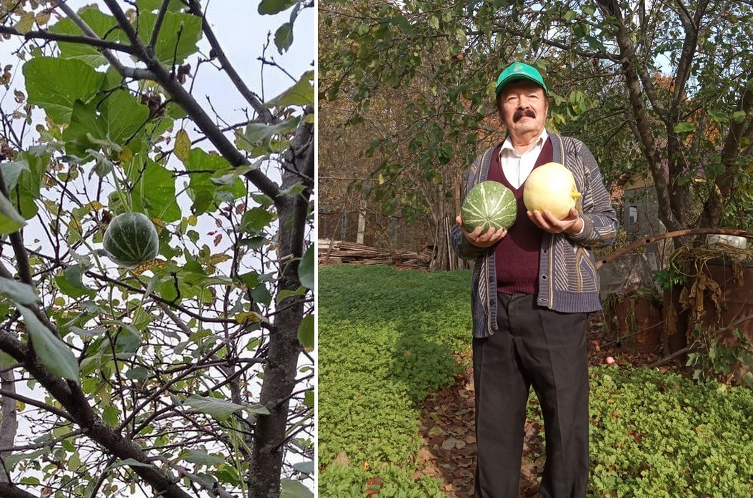 Отползла тыква в сторону, зацепилась за ствол яблони и добралась до самой вершины. Увидел ее садовод только осенью, когда опала листва — висит его тыковка на дереве на высоте пяти метров.