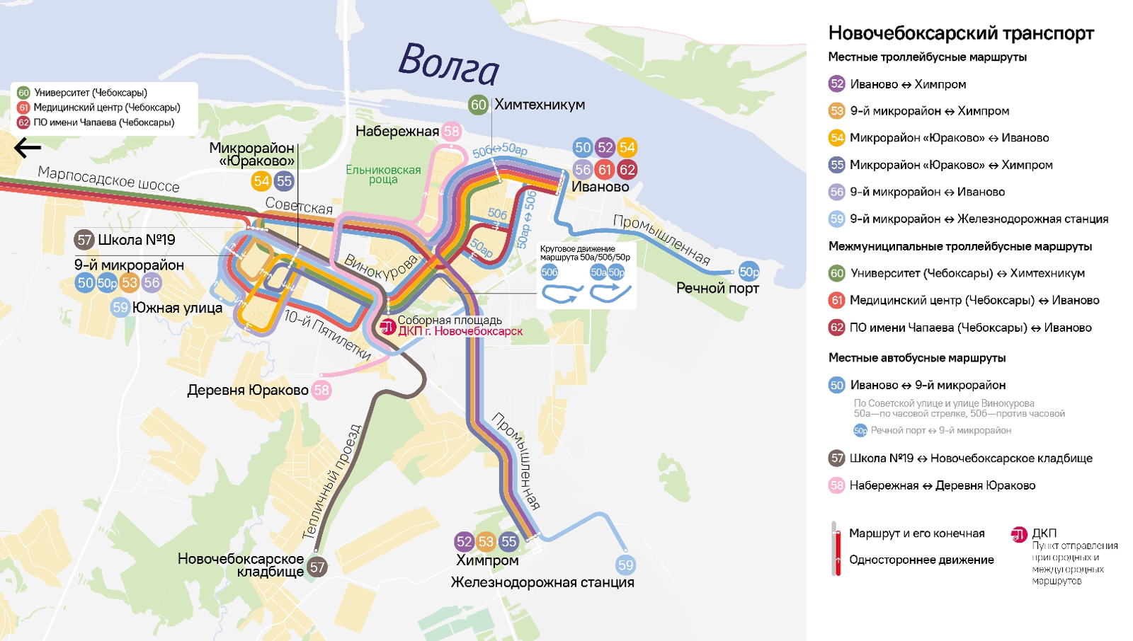 Схемы троллейбусных маршрутов между Чебоксарами и Новочебоксарском:№60 «Университет-Химтехникум»