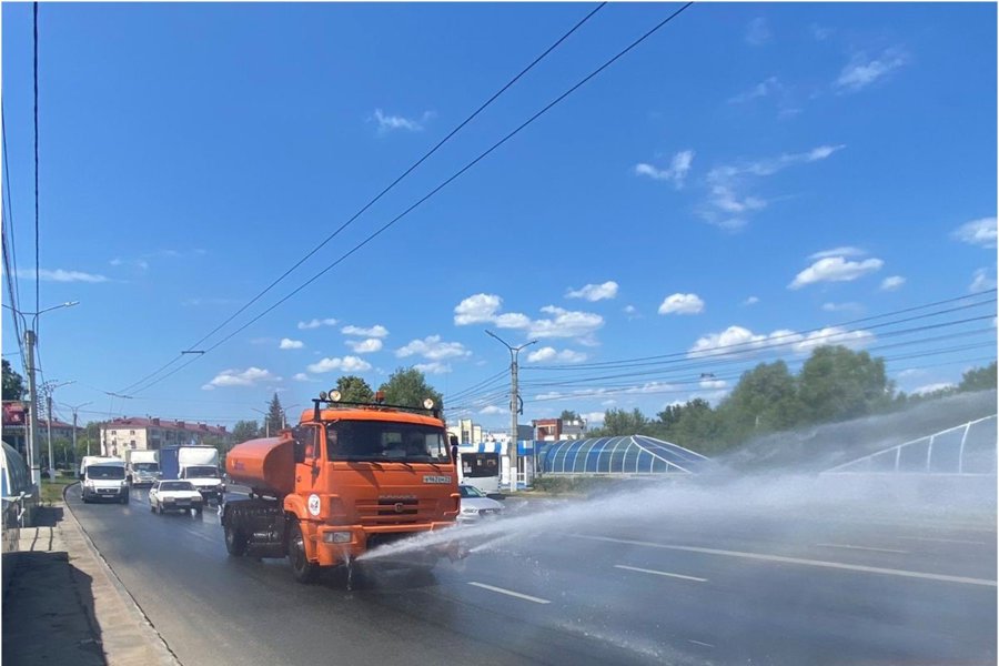 Столбики термометров в Чебоксарах сегодня поднялись до +27 С. В связи с жаркой погодой по заданию главы администрации г. Чебоксары Дениса Спирина дорожники проводят комплексную поливку городских дорог.