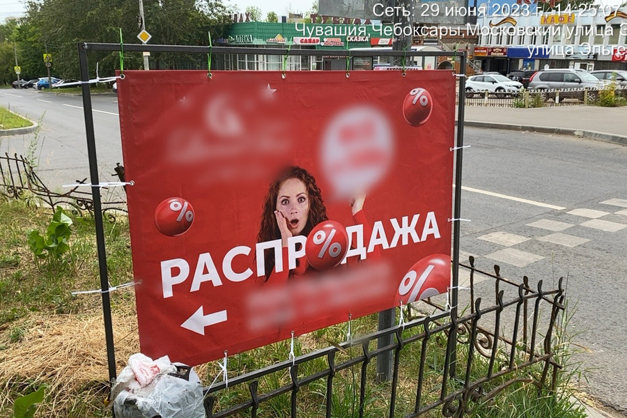 Так, в Московском районе г. Чебоксары выявлен факт размещения рекламной конструкции с информацией о проведении распродажи постельного белья по ул. Эльгера, д. 11. Конструкция находилась в неустановленном для этих целей месте и не имела согласования на ее размещение.
