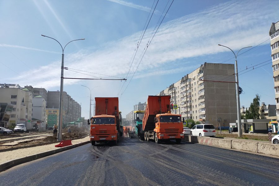 На проезжей части улицы Гражданская в Чебоксарах продолжается финишная укладка асфальта.