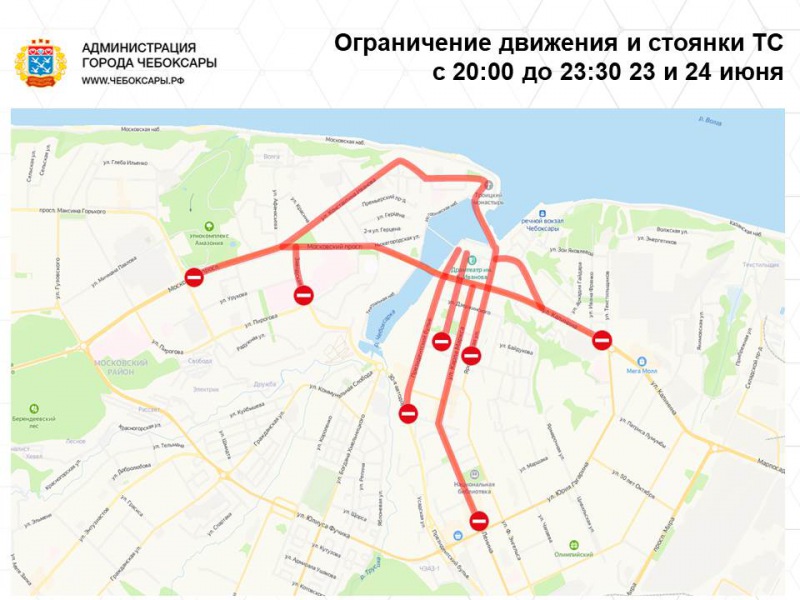 С 20 час. 00 мин. до 23 час. 30 мин. 23 и 24 июня будет ограничено движение транспортных средств (за исключением общественного транспорта) по пр. Ленина (от пересечения с улицей Гагарина до улицы Карла Маркса), по улицам Карла Маркса, Композиторов Воробьевых, Константина Иванова, Калинина (от пересечения с улицей Гагарина до улицы Композиторов Воробьевых), Академика А.Н. Крылова (от пересечения с Московским проспектом до пересечения с улицей Пирогова), Ленинградская, Сергия Радонежского, Ярославская (от пересечения с улицей И.С. Тукташа до пересечения с улицей Сергия Радонежского), Московскому проспекту (от Московского моста до пересечения с улицей 500-летия города Чебоксары), Президентскому бульвару (от пересечения с 30 автодорогой до пересечения с площадью Красной), дамбе Чебоксарского залива города Чебоксары.