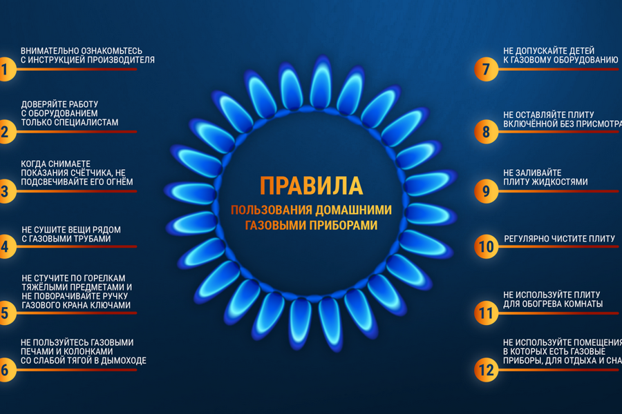 использовать газ и газовые приборы не по назначению; пользоваться газовыми плитами для отопления помещений; пользоваться помещениями, где установлены газовые приборы, для сна и отдыха; применять открытый огонь для обнаружения утечек газа;