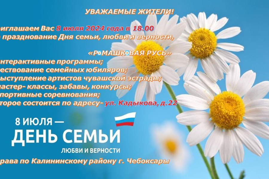 8 июля, в День семьи, любви и верности, приглашаем всех желающих посетить праздничный концерт «Ромашковая Русь» на площадке возле дома №22 по улице Кадыкова. В программе запланированы выступления артистов чувашской эстрады, творческих коллективов, чествования многодетных семей, вручение общественных наград, мастер-классы, забавы, конкурсы, спортивные состязания и многое другое.