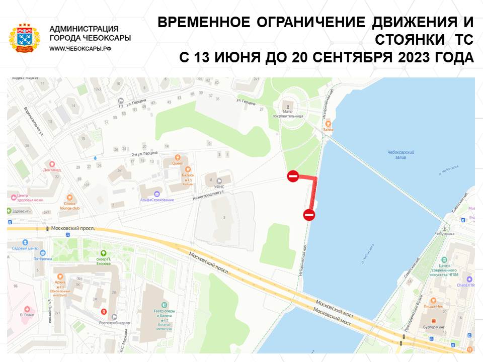 В целях проведения Чебоксарского фестиваля цветов вводится ограничение движения и стоянки транспортных средств с 13 июня 2023 года по 20 сентября 2023 года по улице Нижегородской от дома № 3 до Исторической набережной,