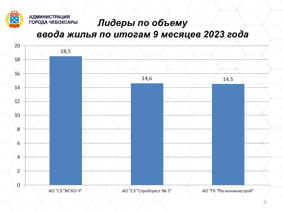 Лидерами отрасли по вводу жилья являются застройщики - ИСКО-Ч (введено 18,5 тыс.кв.м), стройтрест 3 (введено 14,6 тыс.кв.м), «Регионжилстрой (введено 14,5 тыс.кв.м).