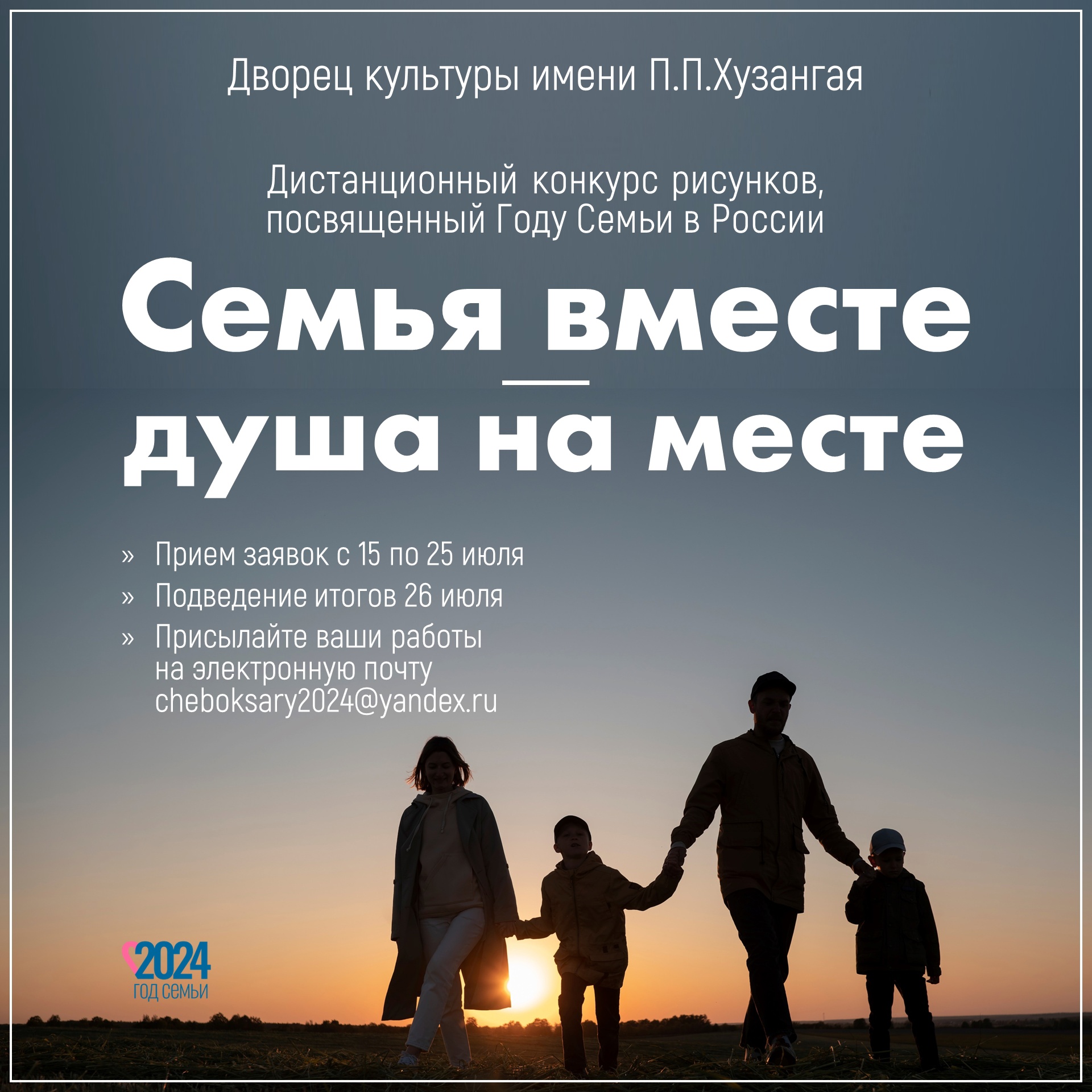 Так, МАУК МК «Победа» (ДК имени П.П.Хузангая) объявляет о начале приёма заявок на участие в дистанционном городском конкурсе рисунков «Семья вместе – душа на месте», посвященного Году семьи в России.