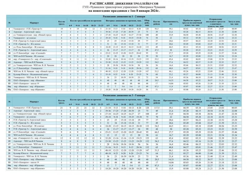 Расписание движения троллейбусов на новогодние праздники с 1 по 8 января 2024г.