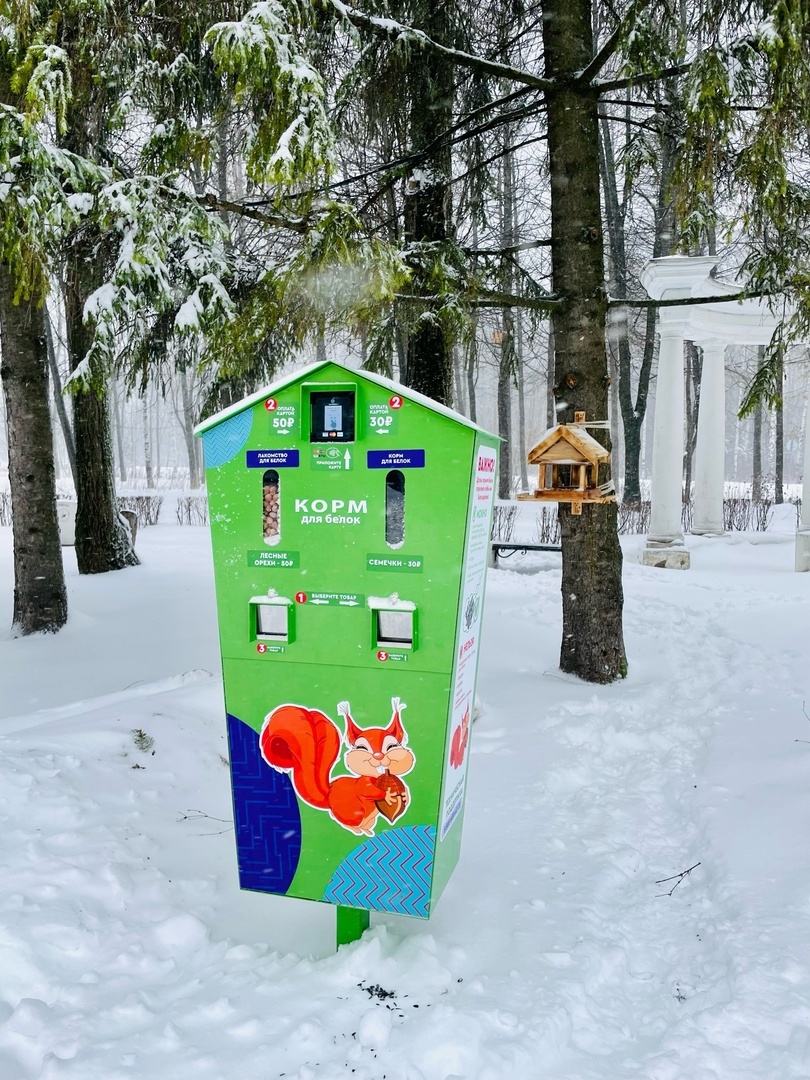 В парке «Амазония» установлен автомат с кормом для белок. Белки в парке обитают на деревьях, растущих на Аллее скульптур с амазонками.