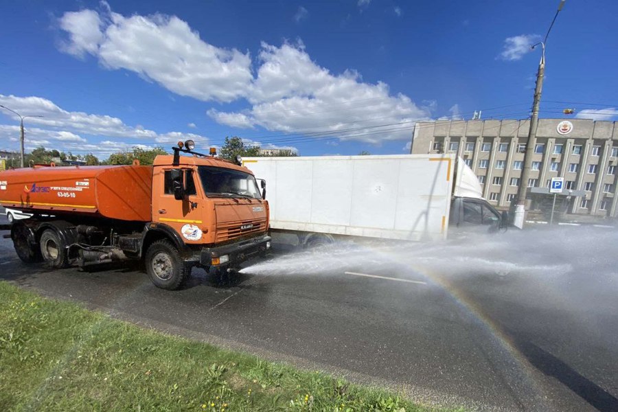 В связи с жаркой погодой поливомоечные машины АО «Дорэкс» работают на улицах города ежедневно.