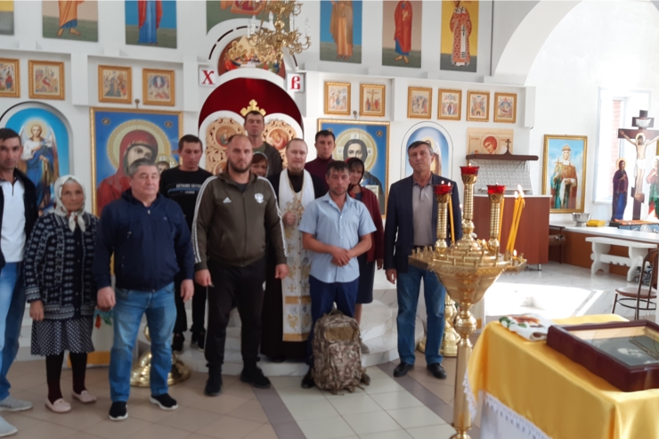 В конце, настоятель храма протоиерей Максим Петров окропил добровольца святой водой и подарил военный молитвослов. А представители местной власти вручили добровольцу военный рюкзак с необходимым довольствием.