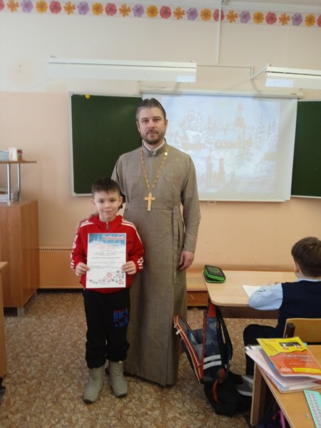 конкурса рисунков "Рождество глазами детей" одному из учеников класса, а также рассказал о событии Рождества Христова.