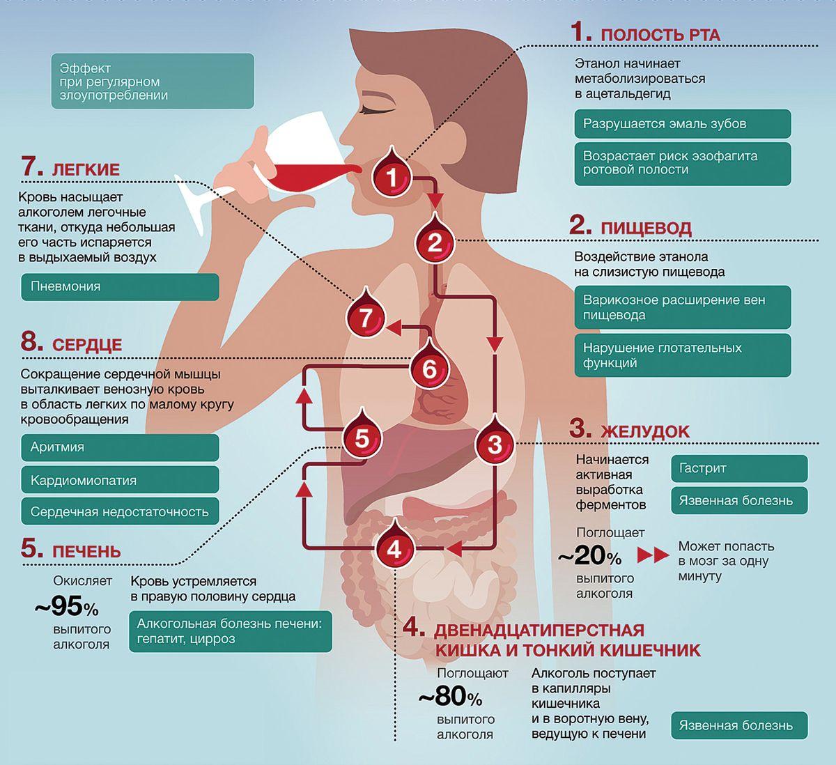 Под воздействием этанола и его метаболитов происходят необратимые изменения внутренних органов. Больше всего страдает желудочно-кишечный тракт и сердечно-сосудистая система. По статистике, большинство смертей от алкогольной зависимости случаются по причине этих болезней.