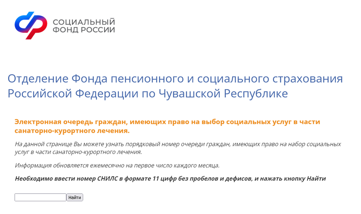Проверить свою очередь на санаторно-курортное лечение можно на сайте Социального фонда России по адресу https://social-insurance.sfr.gov.ru/r21/ на странице Отделения СФР по Чувашии в разделе “Гражданам”. Следует выбрать “Санаторно-курортное лечение”, затем “Электронную очередь на санаторно-курортное лечение”. Нажав на последнюю ссылку, вы перейдете в электронную очередь и, введя номер своего СНИЛСа без пробелов и дефисов, узнаете свой порядковой номер в очереди. Информация на сайте обновляется ежемесячно.