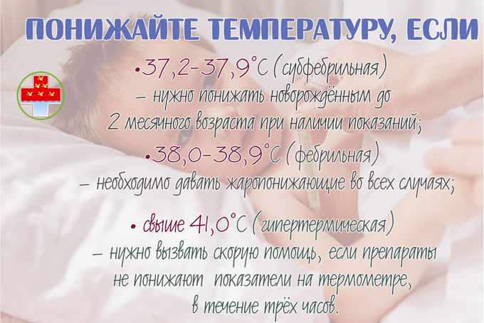 37,2-37,9°C (субфебрильная) – нужно сбивать новорожденным до 2 месячного возраста при наличии показаний; 38,0-38,9°C (фебрильная) – необходимо давать жаропонижающие во всех случаях; свыше 41,0°C (гипертермическая) – нужно вызвать скорую помощь, если препараты не понижают показатели на термометре.Вызвать неотложку необходимо при появлении лихорадочных спазмов – это непереносимость высокой температуры, индивидуальная особенность детского организма. Данное состояние обычно не встречается у детей старше 6 лет (при условии отсутствия патологий со стороны центральной нервной системы).