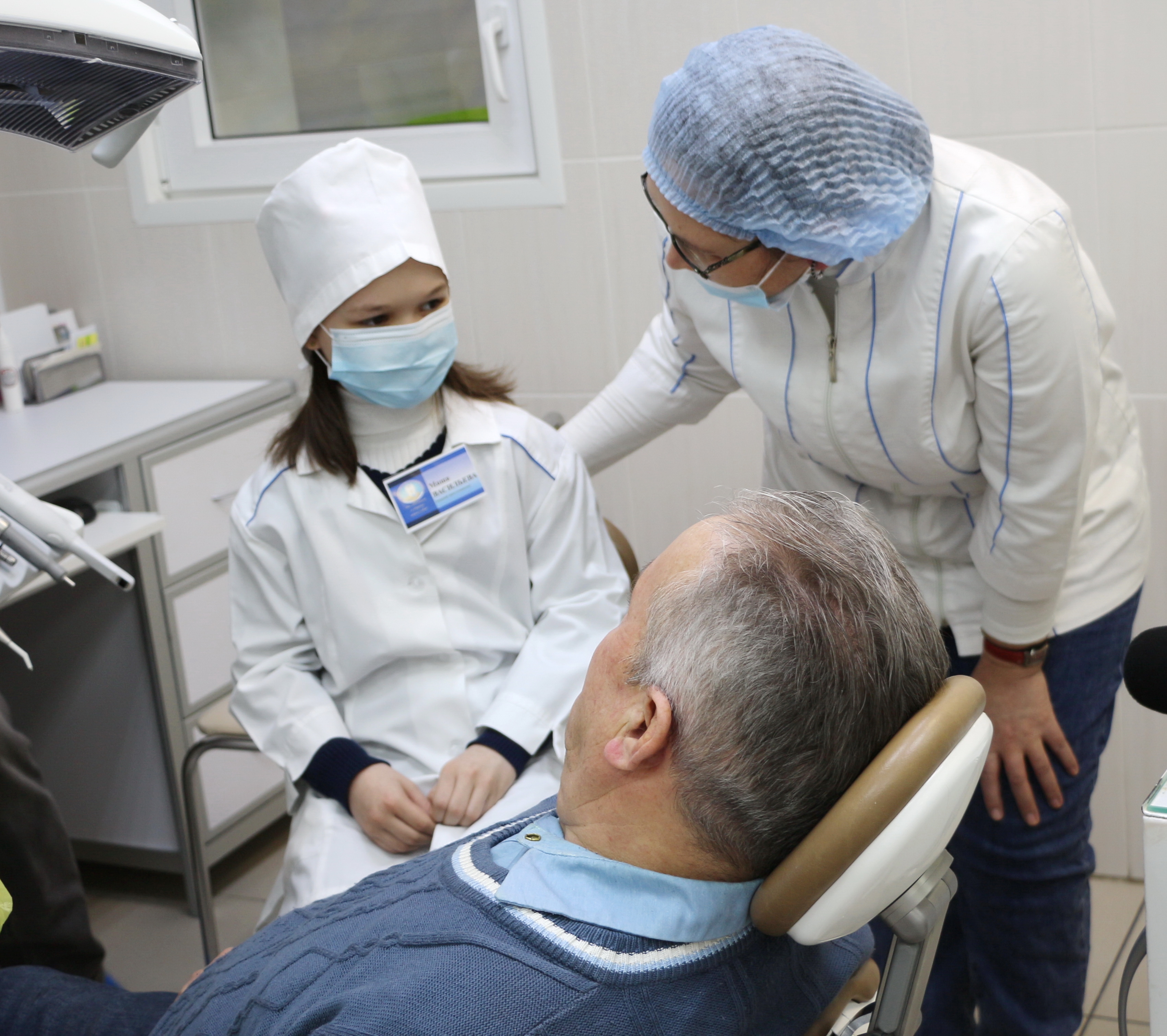 Для Маши и ее дедушки, который сопровождал внучку, организовали экскурсию по поликлинике, рассказали, чем занимаются стоматологи, показали их рабочие места. В белом халате и шапочке, с бейджиком на груди, специально подготовленным для такого случая, Маша с восхищением слушала экскурсовода, рассматривала оборудование, пообщалась со стоматологами, попробовала себя в роли зубного врача и почистила зубы на макете челюсти - сначала с обычной щеткой, потом - с использованием углового наконечника.