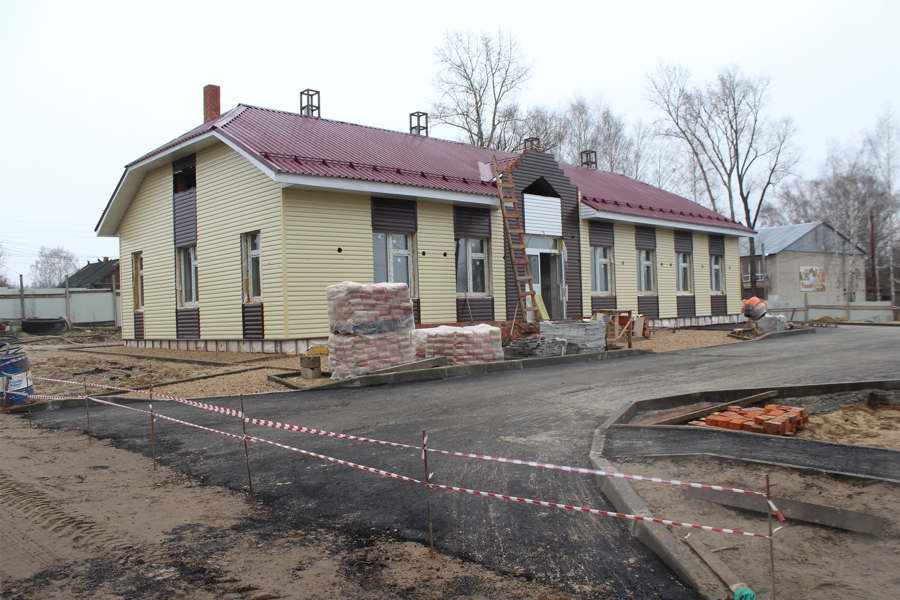 На сегодняшний день рабочие завершили устройство фасада и карниза, подвели к зданию сети водопровода, канализации и газоснабжения. Ведутся на объекте и внутренние работы: отделка стен и полов, готовятся начать прокладку системы отопления.